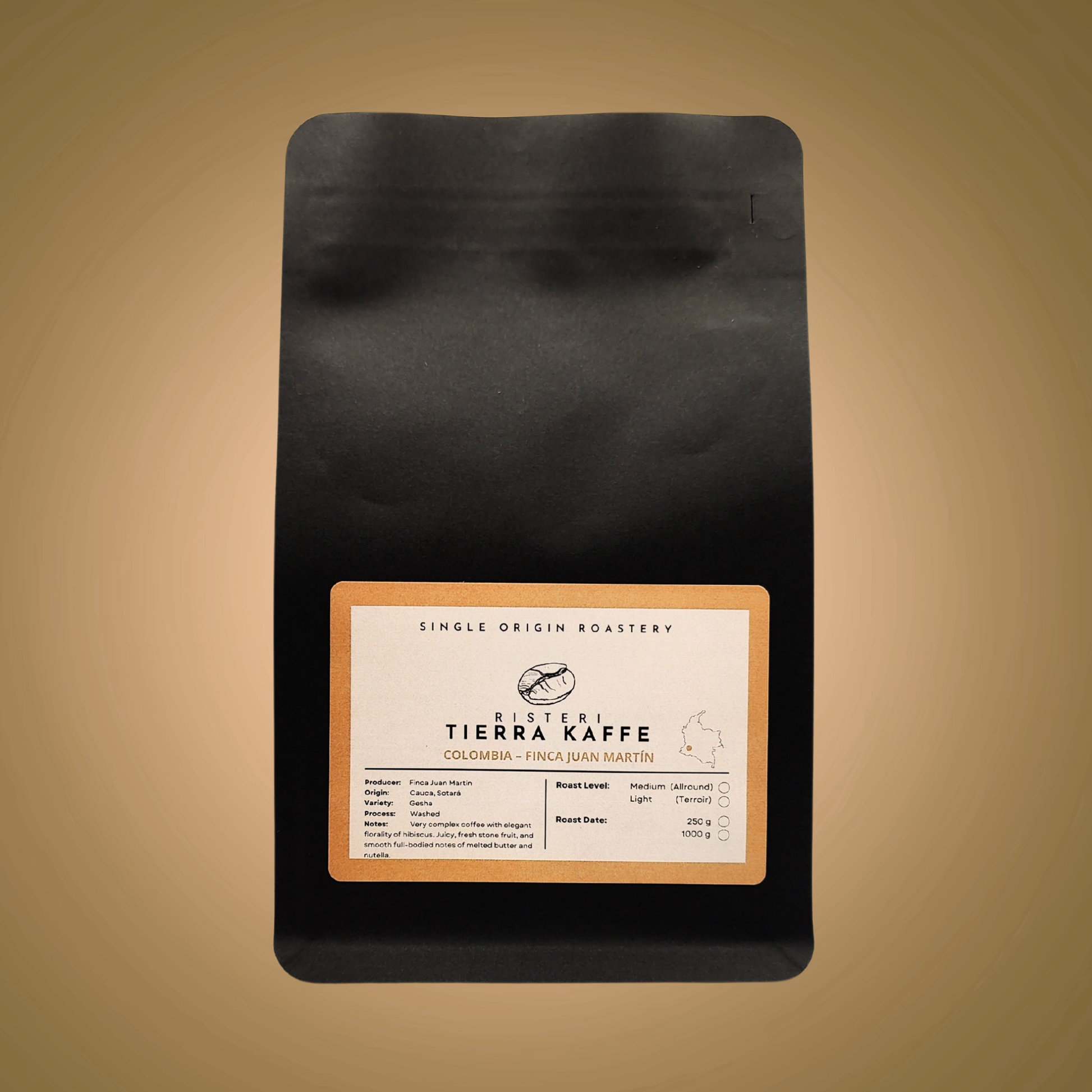 Overlegen Gesha-kaffe fra farmen Juan Martín, der ligger i byen Sotará i Cauca-distriktet i det sydvestlige Colombia. I Sotará ligger også den aktive vulkan af samme navn. Selvom der ikke er registreret udbrud, producerer Sotará stadig fumaroler og varme kilder. Finca Juan Martíns kaffe bærer derfor præg af en vulkansk jord fuld af mikronæringsstoffer og et helt særligt terroir.