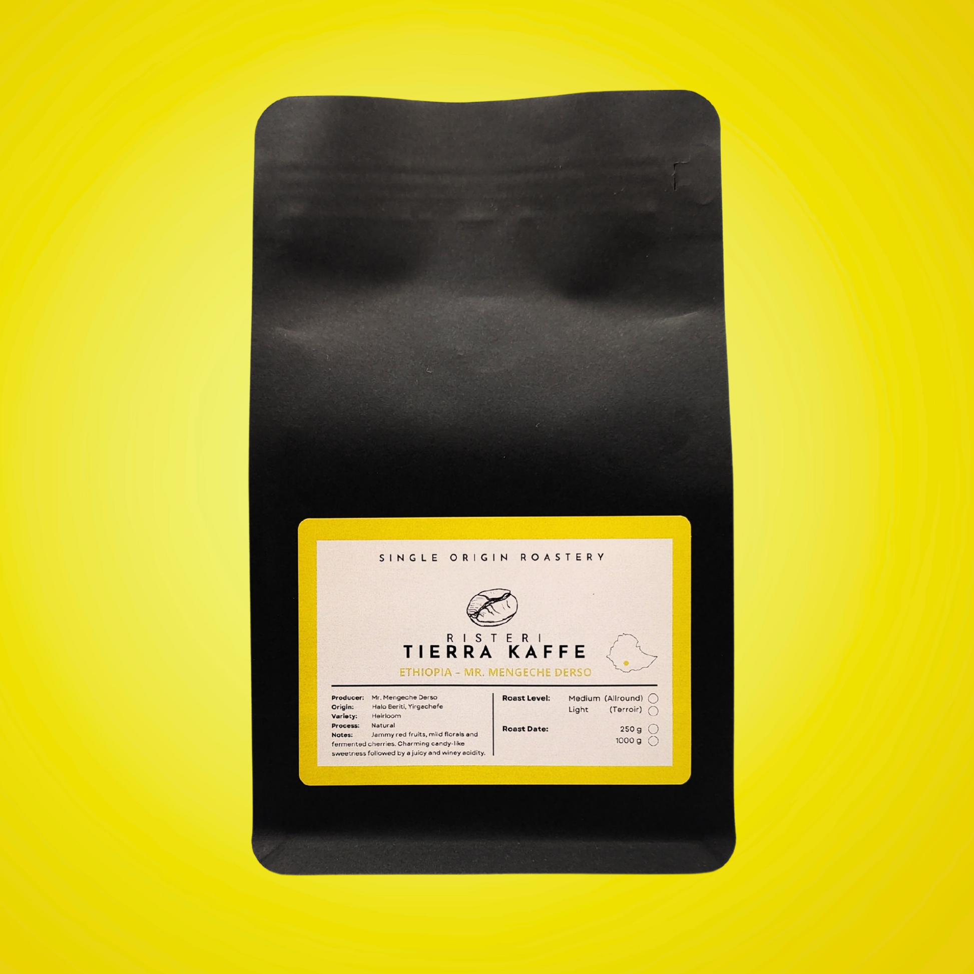 Charmerende og elegant naturalkaffe, der dyrkes i højlandet af Mr. Derso i Yirgacheffe i det sydlige Etiopien. Mr. Derso er i 60’erne og har 12 børn, hvoraf 4 af de voksne børn også hjælper til på kaffefarmen.